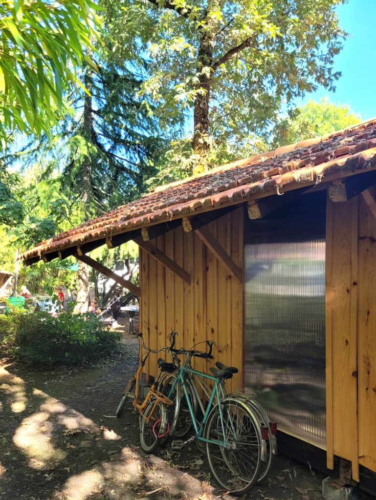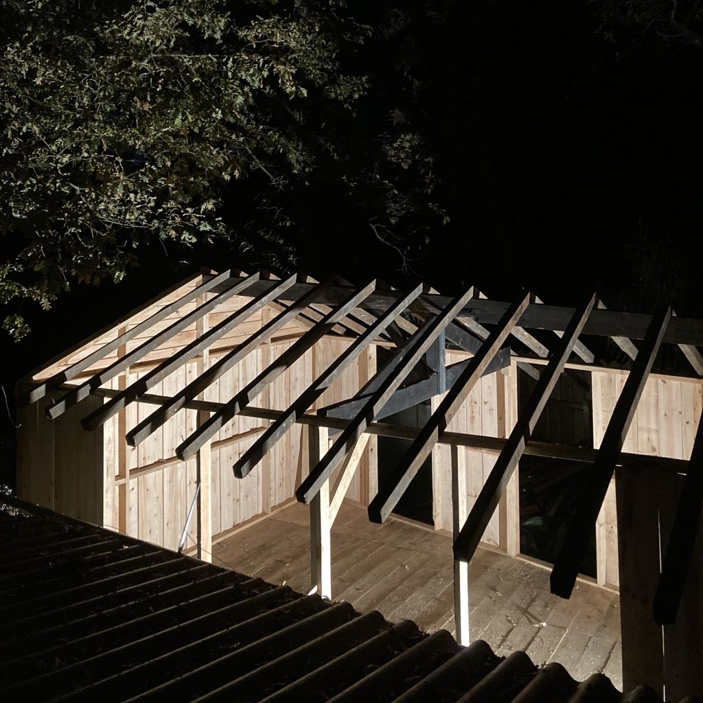 Construction à Taussat-les-Bains d’une cabane en réemploi, à partir de bois de charpente récupéré sur une grange démontée à quelques encablures, à Andernos-les-Bains. Les tuiles proviennent également de cette déconstruction préalable.