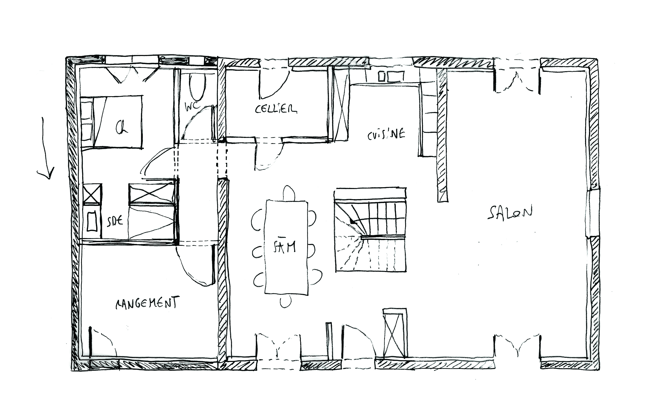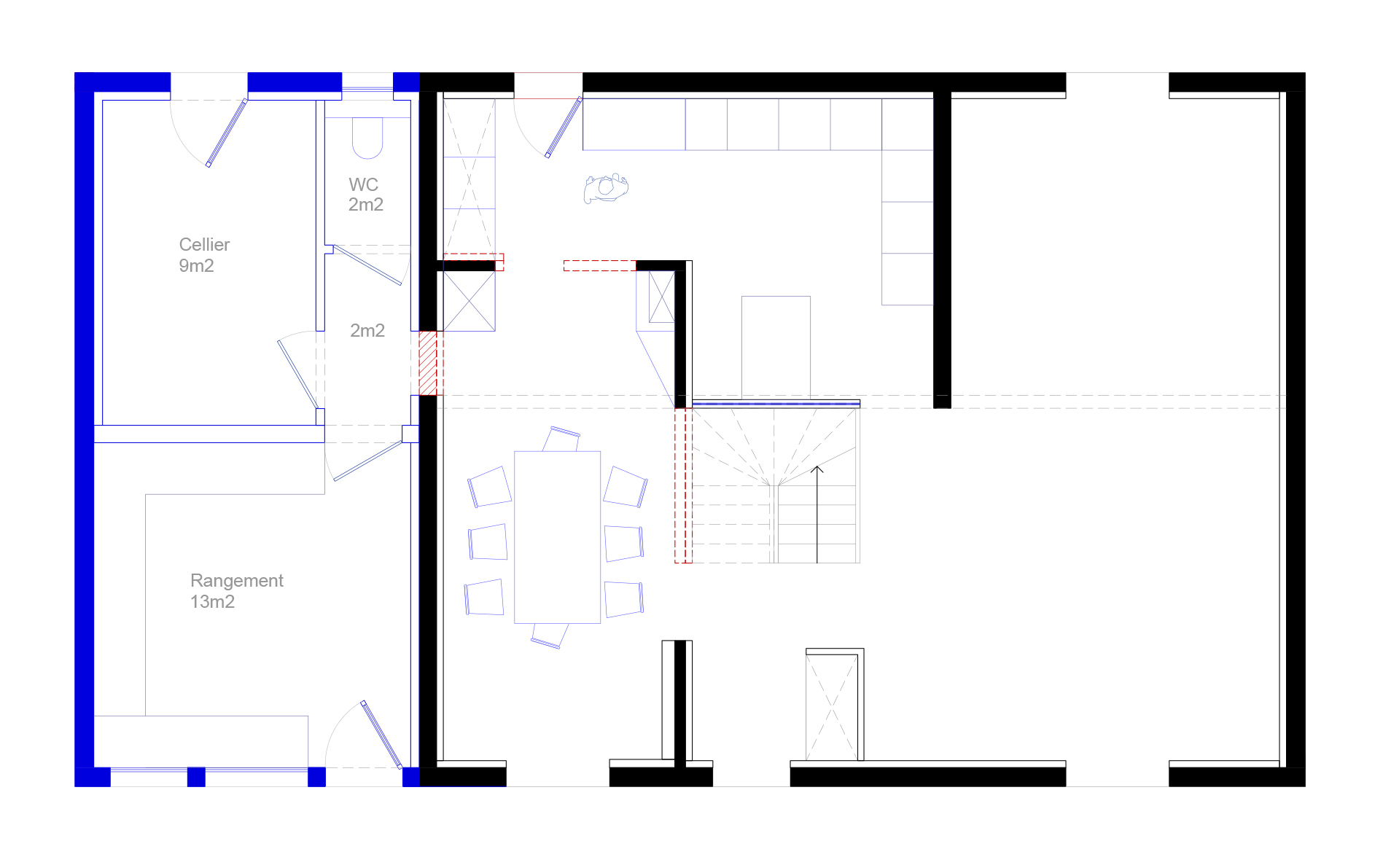 Remplacement d’une extension suite à un désordre. Prolongement du salon par des pièces techniques réversibles.