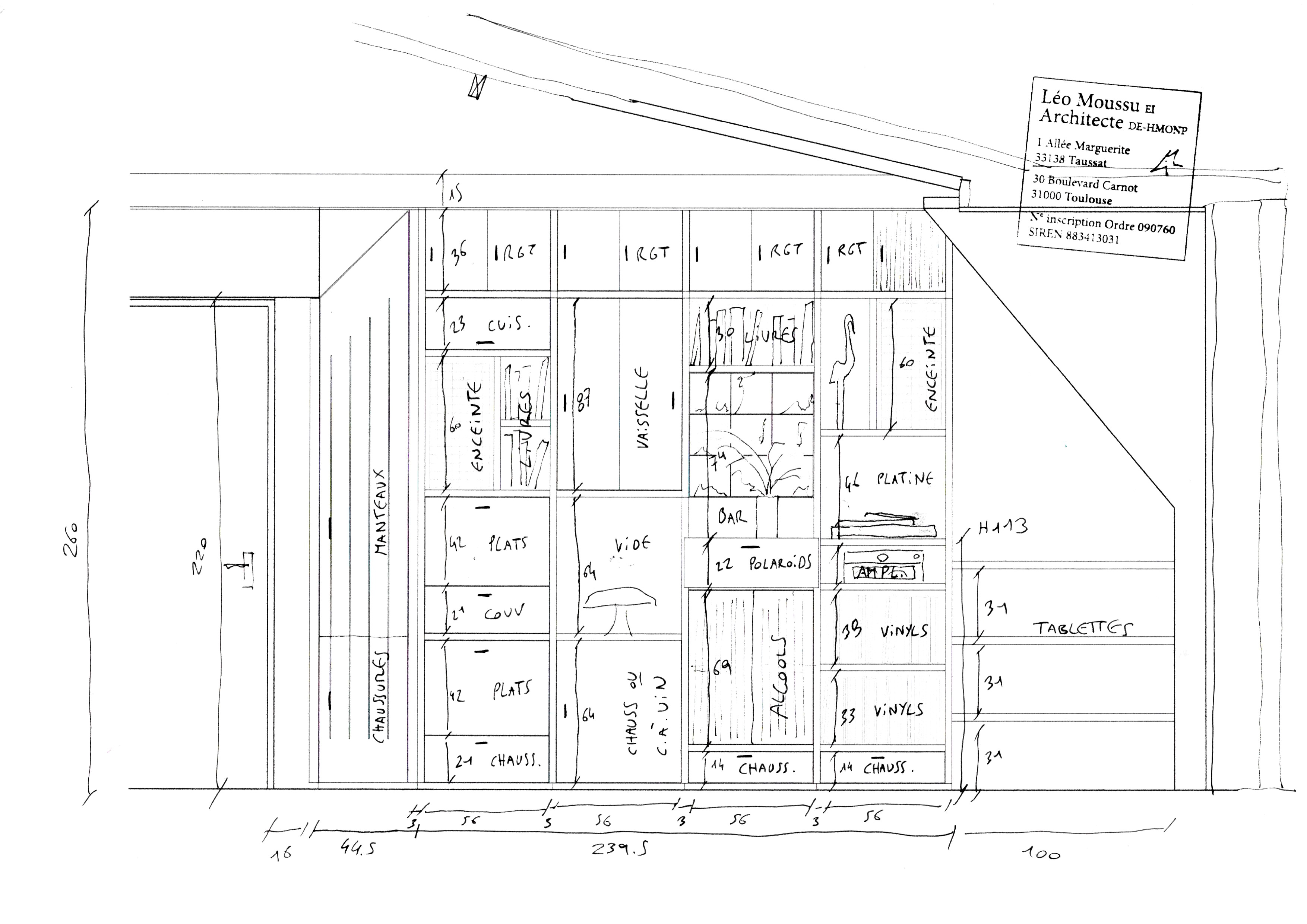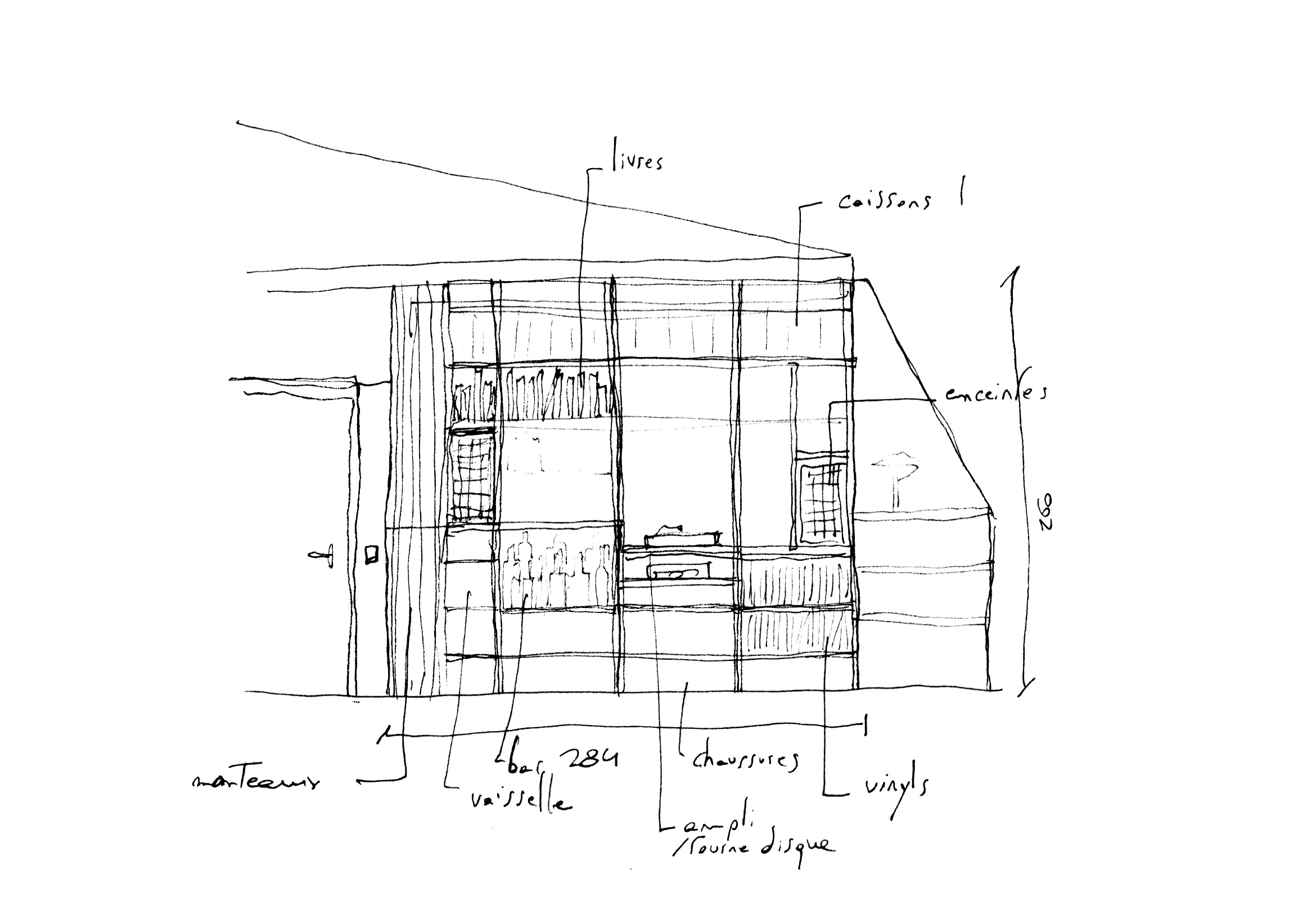 Meuble bibliothèque sur mesure en bois massif rassemblant bar, système son, vaisselier et rangement d’entrée.