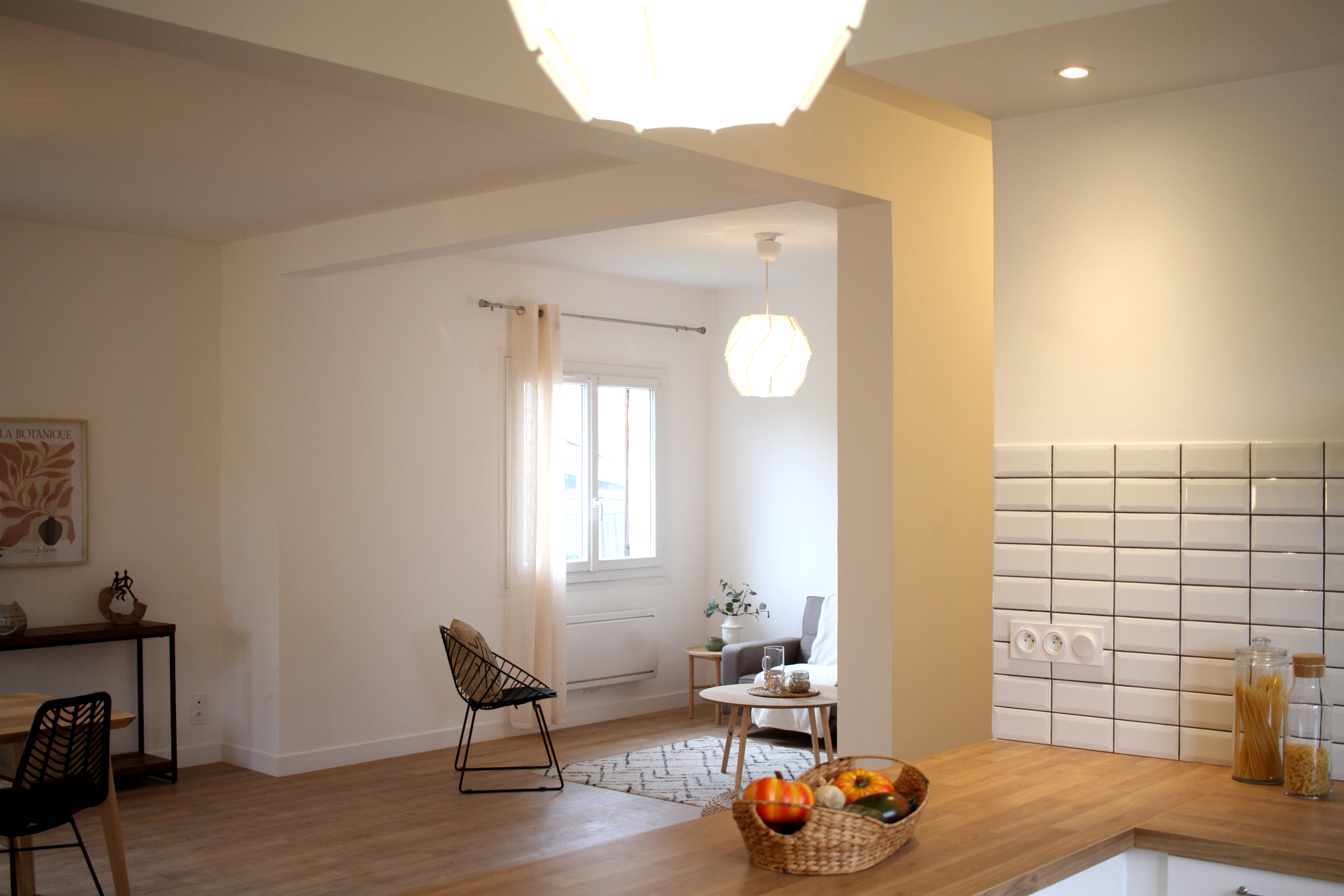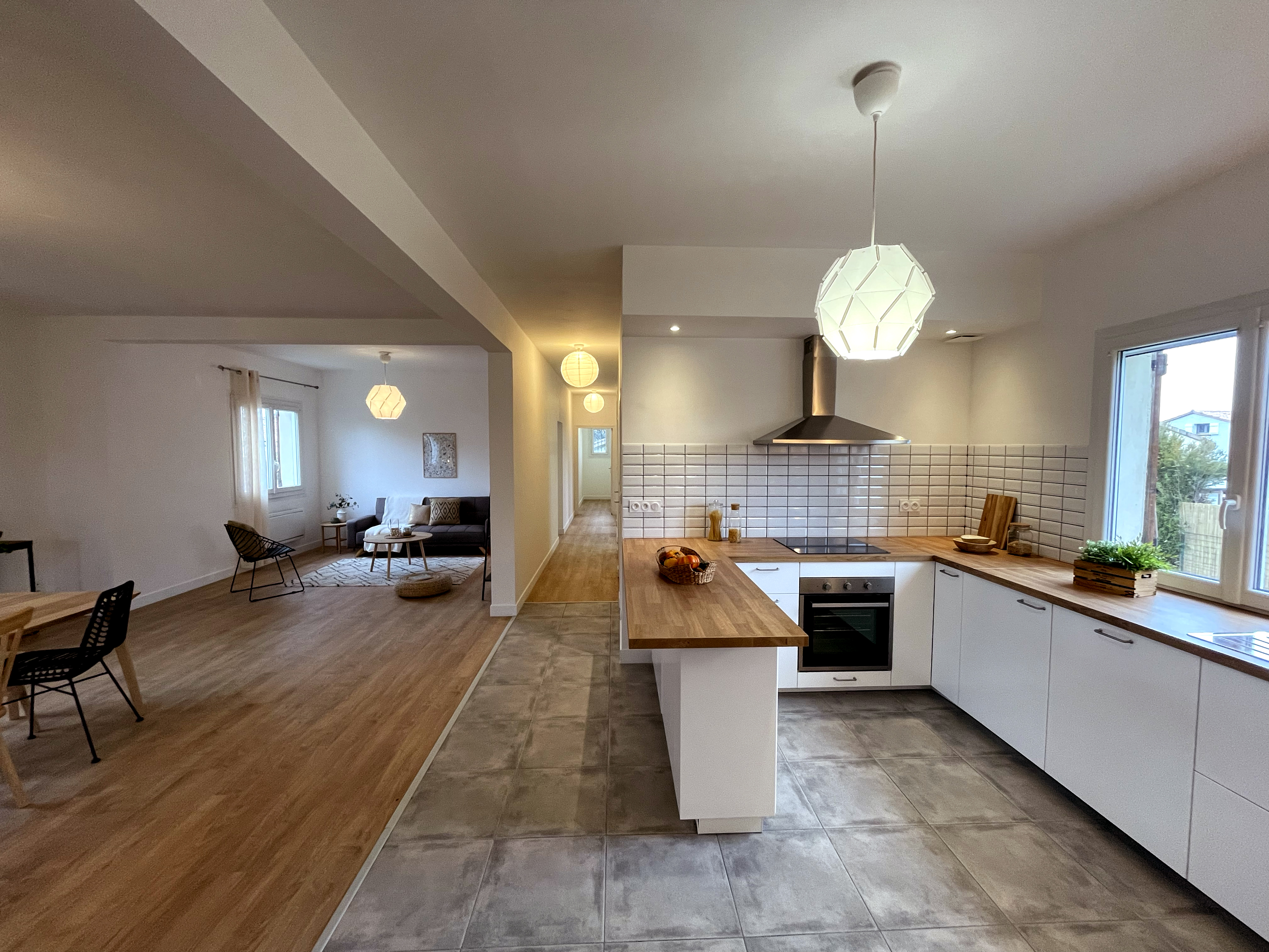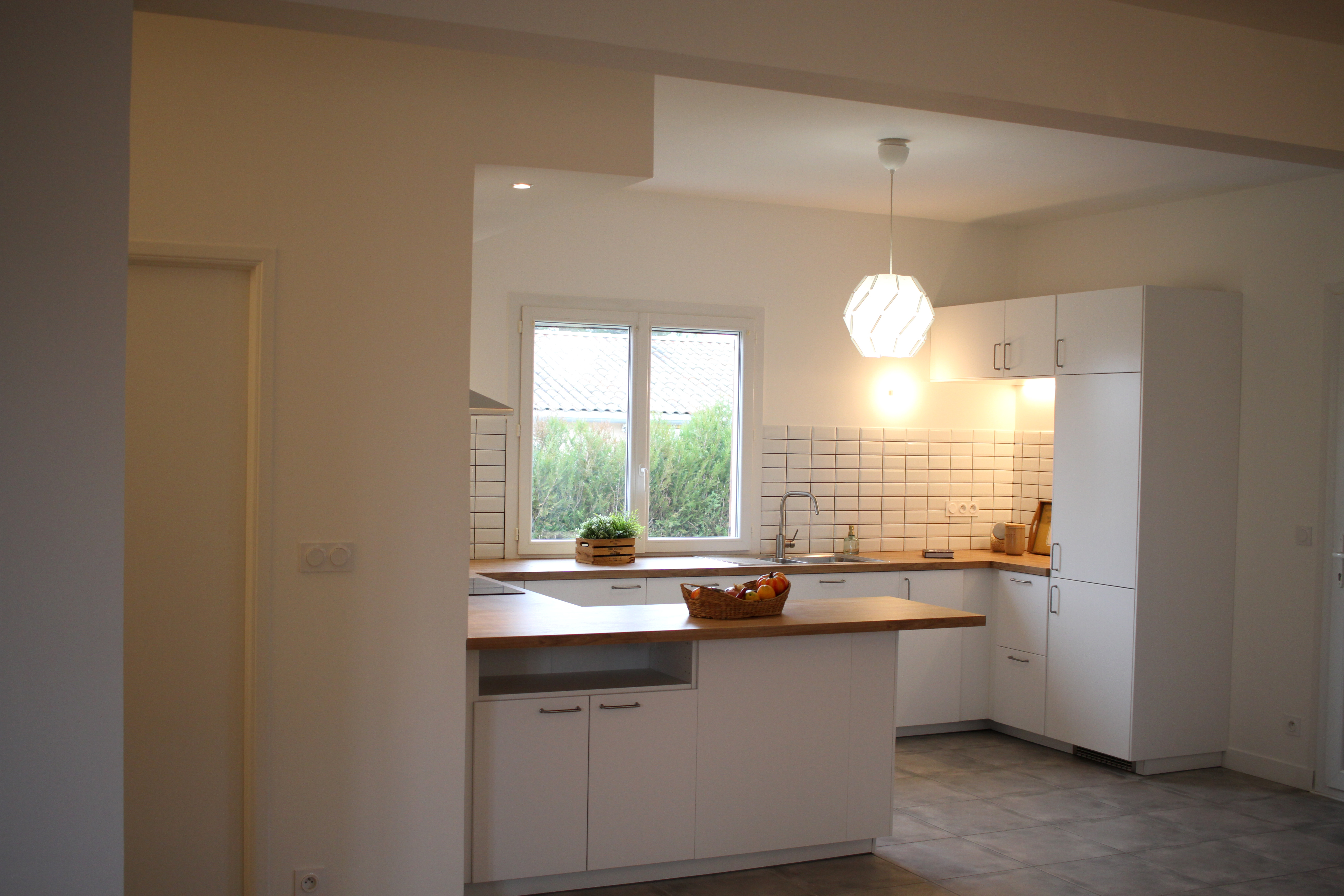 Rénovation complète d’une maison des années 1980 dans la banlieue de Toulouse. Agrandissement du salon et de la cuisine.